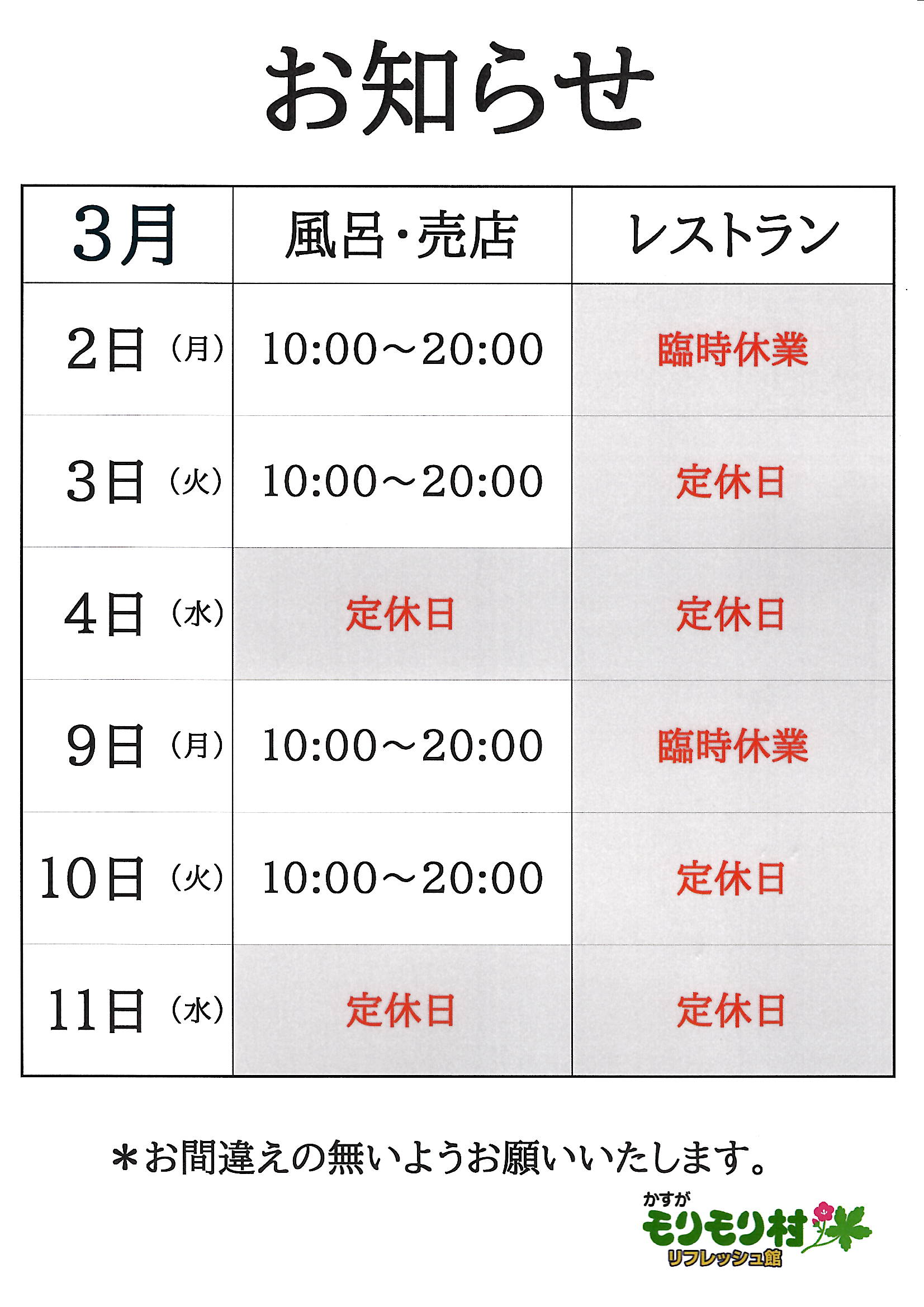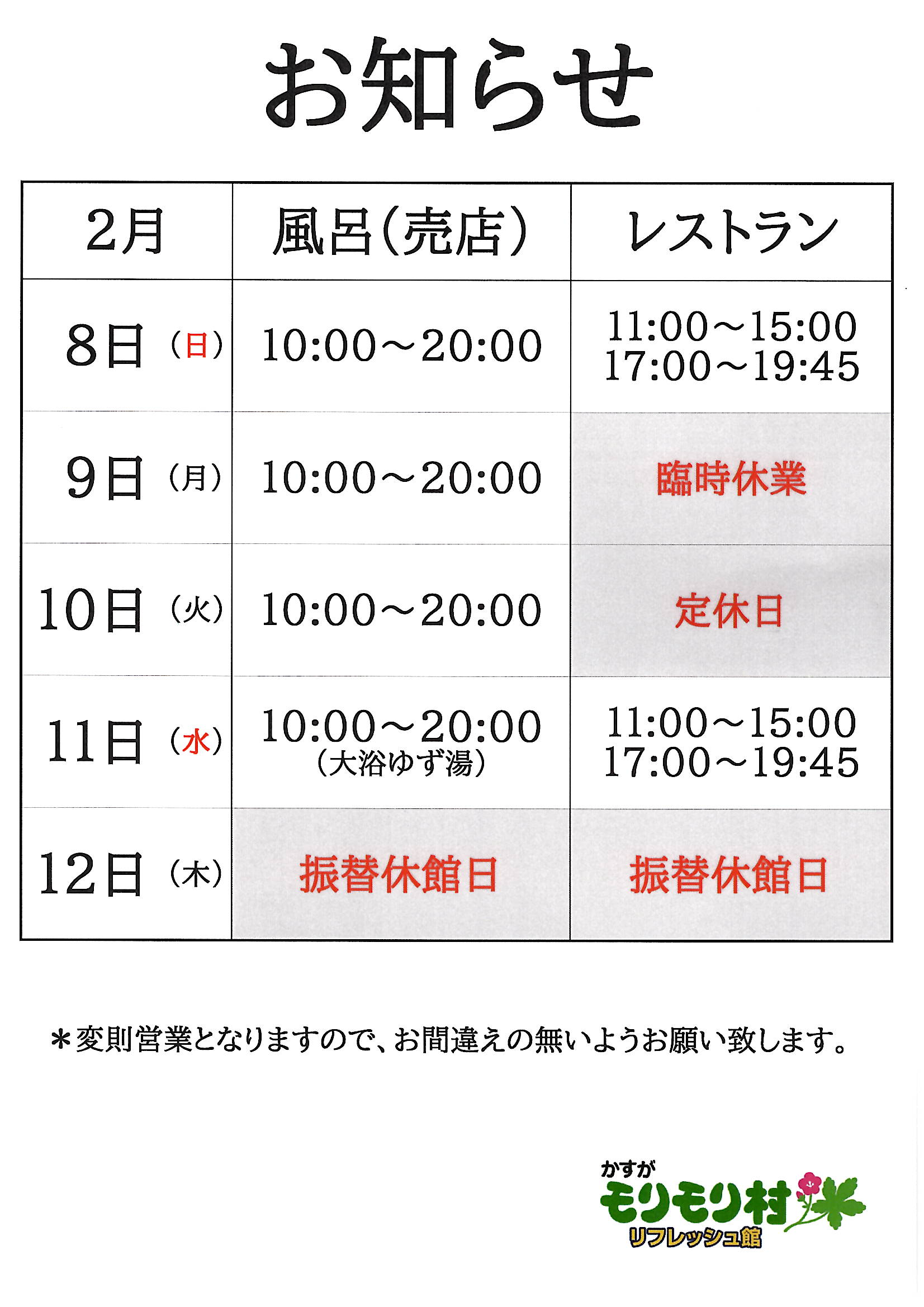 かすがモリモリ村リフレッシュ館は1月13日(火)臨時休業します。