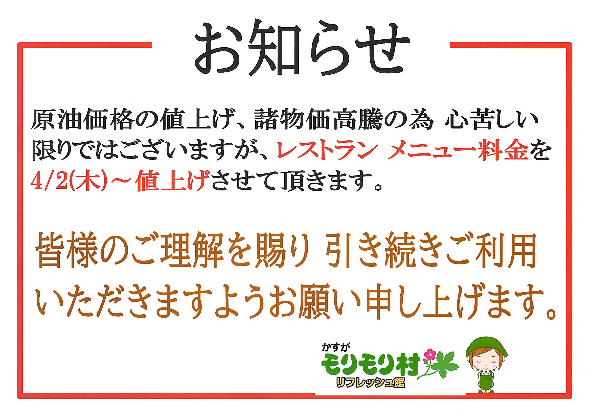 レストランより価格改定のお知らせ(2026年4月2日~)
